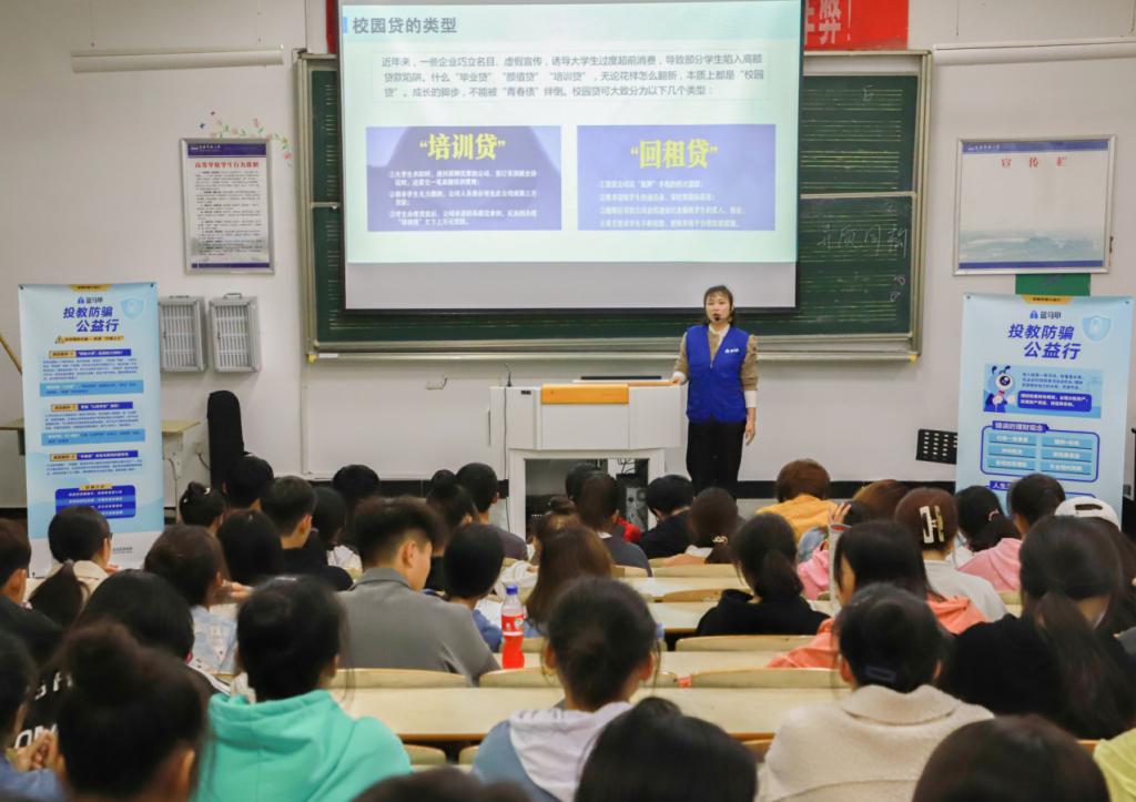 “有人知道‘杀猪盘’式诈骗手法吗?”活动伊始,王丽以电信网络诈骗类型为切入点,向学生们介绍了刷单、裸贷、虚假理财贷等大学生常见的诈骗类型。结合典型案例和亲身经历,王丽从日常生活、电信网络等多方面剖析诈骗分子的惯用手段和作案方式,告诫学生们要提高防电信网络诈骗意识,守护好自己的“钱袋子”,切勿轻信转账信息,树立正确消费观。