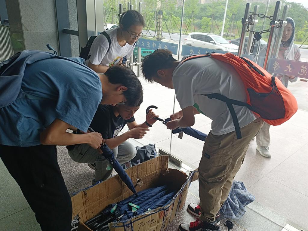 有了想法后,学生工作人员们说干就干,通过线上、线下联系政府部门、社会公益性组织、企业等,先后筹集了一千余把雨伞。5月16日,第一批到货的135把雨伞已经发放到了菱湖、龙山两校区的三栋教学楼,为同学们带来了实实在在的便利。