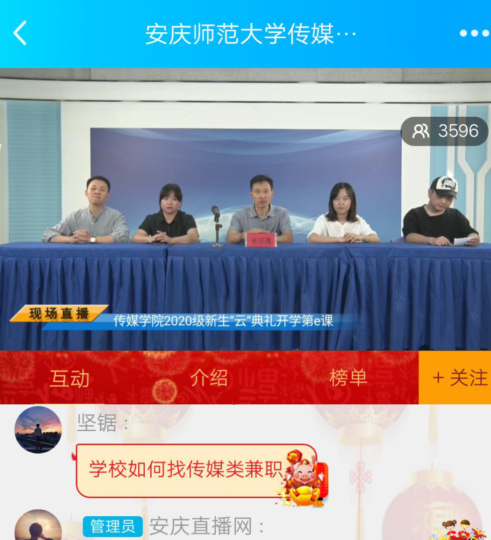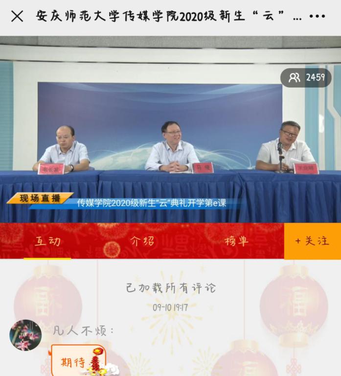 “欢迎大家来到传媒学院这个大家庭,今天我们将带领大家提前了解校园,也期待两天后的见面。”9月11日,传媒学院采取线上直播互动的方式,举办新生“云”典礼,开展开学第“e”课,向2020级新生与家长介绍学院情况,并线上解答新生疑问。