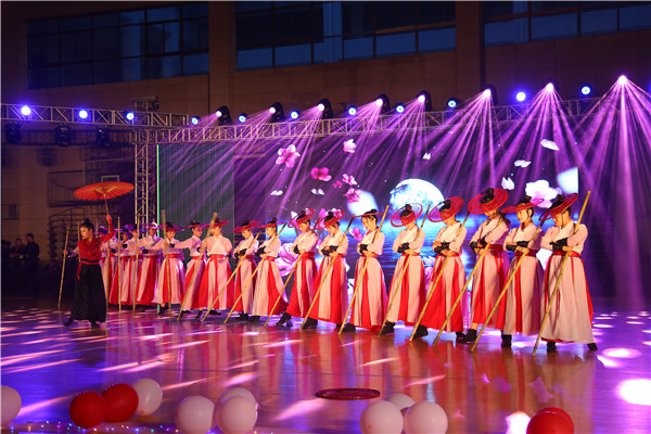 晚会伊始,由体育表演专业2016(1)班带来的啦啦操《Forever Young》作为开场舞率先登场,动感的表演赢得了观众们的喝彩和阵阵掌声;“少年智则国智,少年强则国强。”斗牛舞《青春无悔》的表演者们用其充满活力的舞姿点燃了现场的气氛;头戴一顶斗笠、手持一根木棍,体育表演专业2016(2)班的学生们身披华服站在舞台上,在古筝转弦之间,木棍落地声与鼓声的巧妙结合让现场观众被一股武侠气概深深感染。“现代舞《侠》既是对金庸先生心中‘侠’的诠释,也向大家彰显了中华武侠文化的瑰艳。”