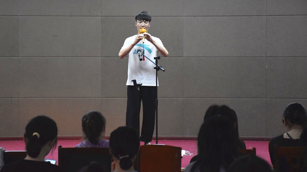 由电子信息类专业2020级(3)班徐云韬带来的葫芦丝独奏《竹林深处》,声调变化丰富,画面感极强。在从小就学习各类乐器的徐云韬看来,相比西方乐器的仪式感,民乐脱胎于人民生活之中,更能给人以亲切感。“学习民乐乐器,对我来说既是陶冶情操的过程,也为展现自己的才艺创造机会。”徐云韬说到。