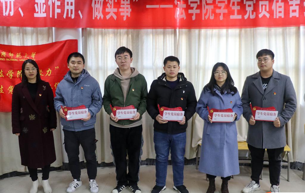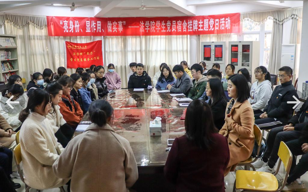 为深入学习贯彻党的十九届六中全会精神,扎实推进党史学习教育,积极探索社区思想政治教育新模式,12月1日,法学院开展“亮身份、显作用、做实事”学生党员宿舍挂牌主题党日活动。学院党委副书记从光梅、“聚力”学生党员服务工作站指导老师和骨干成员以及50名学生党员参加了活动。