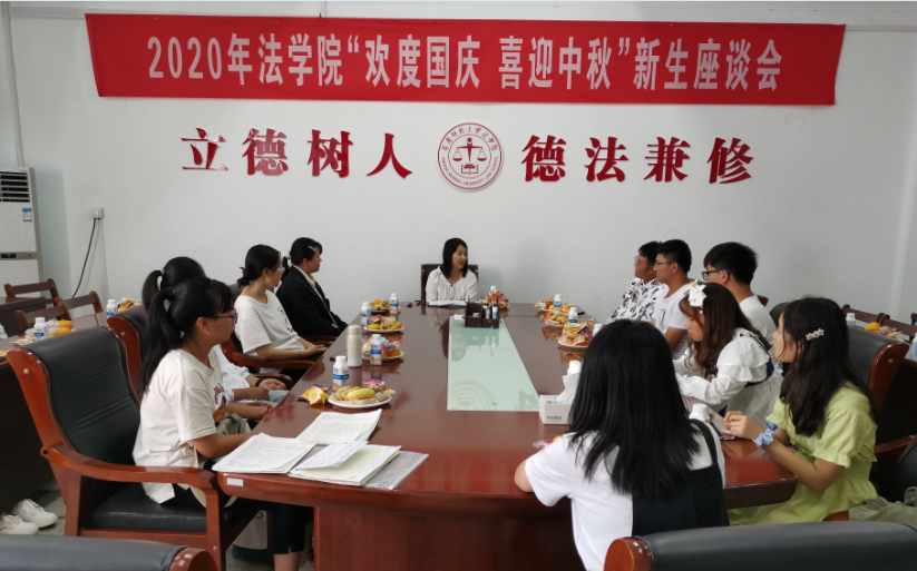 10月1日,是中华人民共和国成立71周年国庆日,也恰逢一年一度的中秋佳节。为让远离家乡的2020级新生在节日里感受到学校的关怀与家的温暖,法学院在国庆中秋当天举办“欢度国庆 喜迎中秋”新生座谈会。学院党总支副书记从光梅、法学类专业新生辅导员和20余名留校新生参加了座谈会。
