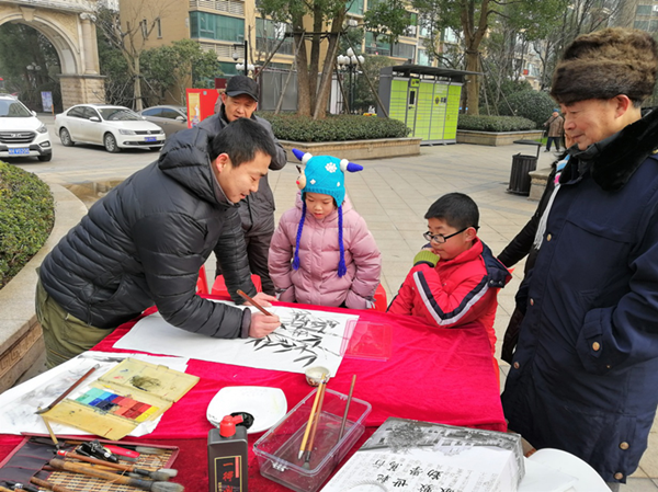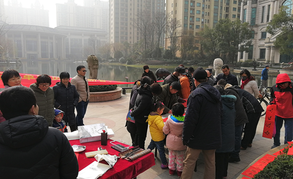 2019年1月13日腊八节,为增加节日气氛,服务社会,开展艺术交流,民革安庆师大支部在恒大绿洲开展“迎新春、送春联”书法活动。