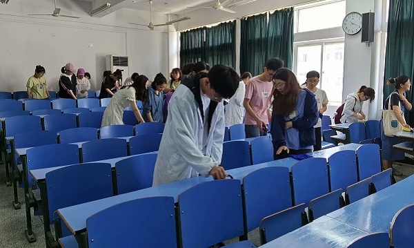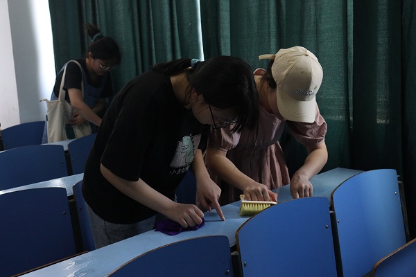 装满一壶自制的清洁剂,均匀地喷洒在桌面上,再用刷子清理污垢,最后用抹布轻轻擦拭。化学专业2019(2)班的戴志远完成自己的任务后,挂满汗水的脸颊也露出了微笑。“保持教室的清洁卫生是我们每个人的责任和义务,作为学生党员,我们更应以实际行动呼吁着大家一起行动起来,共建文明和谐的校园。”,他说。