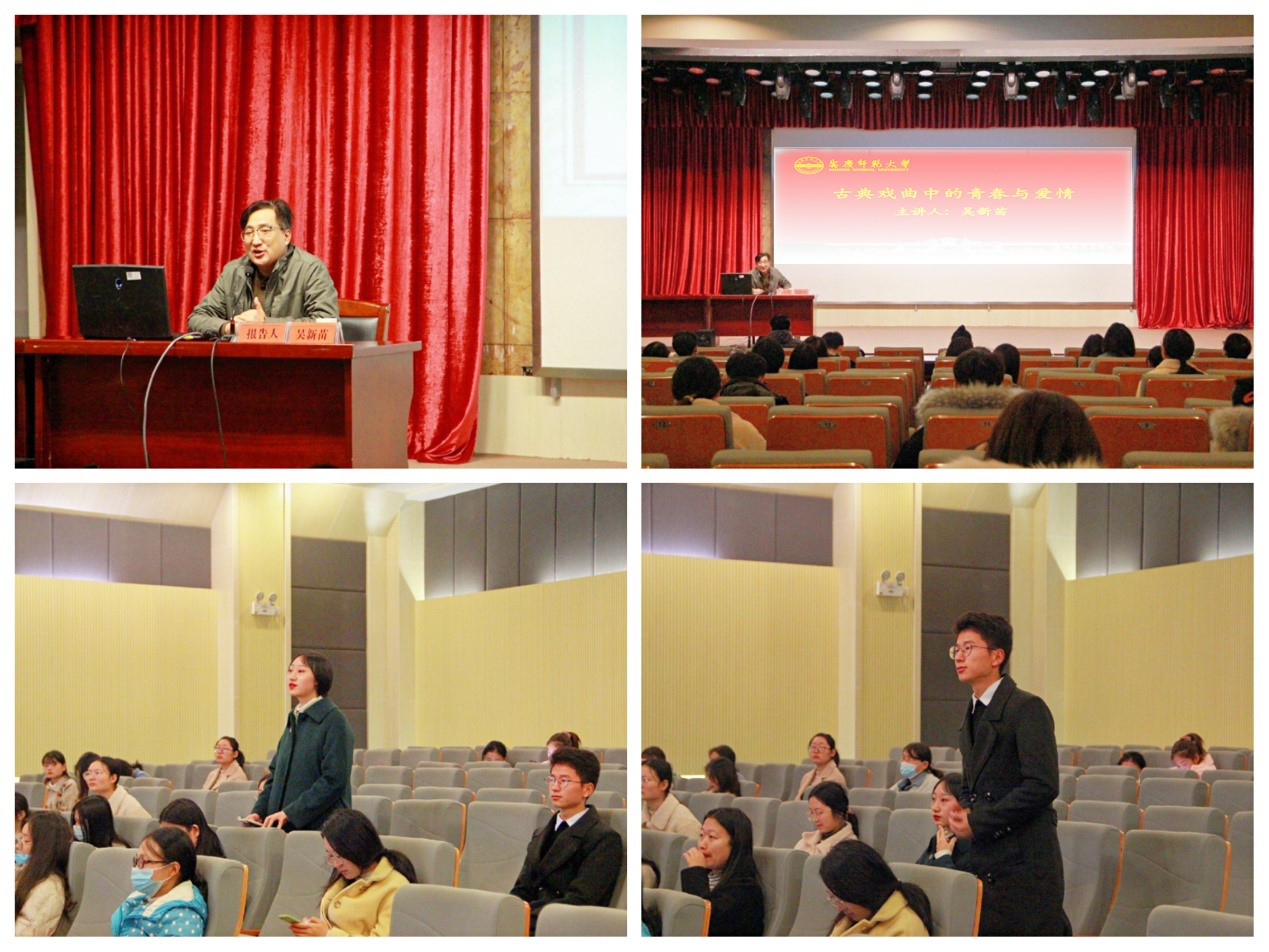 讲座中,吴新苗教授立足于古典戏曲爱情题材的价值取向与表达方式,通过古今戏曲名剧及中西爱情观的比较分析,从爱情的萌生、抑制、升华、复调四个方面,重点对中国古典戏曲青春爱情剧写什么、为什么这样写、怎么写这些问题进行了解读。吴教授认为,“十部传奇九相思”,古典戏曲爱情剧所呈现的青春之美与深情至爱,彰显了古典戏曲本身所蕴含的跨越时空的优美与时尚,对当下的戏曲创作具有重要的启发和借鉴价值。