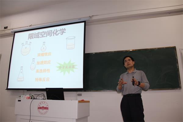 孙为银教授作了以“多孔金属有机框架材料的构筑及其性能研究”为主题的报告。报告中孙为银教授重点围绕多孔金属有机框架材料的理性设计、控制合成与性能调控等方面的研究作了系统的报告。孙教授的报告深入浅出,还将自身的科研经验向师生进行分享,引发了师生的广泛的兴趣,对提高学生的专业认知有着积极作用。