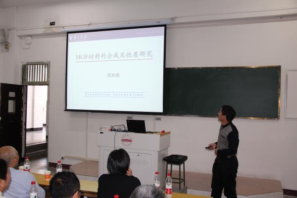郑和根教授作了以“MOF材料的合成及性质研究”为主题的报告。报告中郑和根教授重点讲述了单一MOF材料的合成及性质研究和复合MOF材料的合成及性质研究。郑教授的报告深入浅出,激发了我院师生对配位化学的浓厚兴趣。