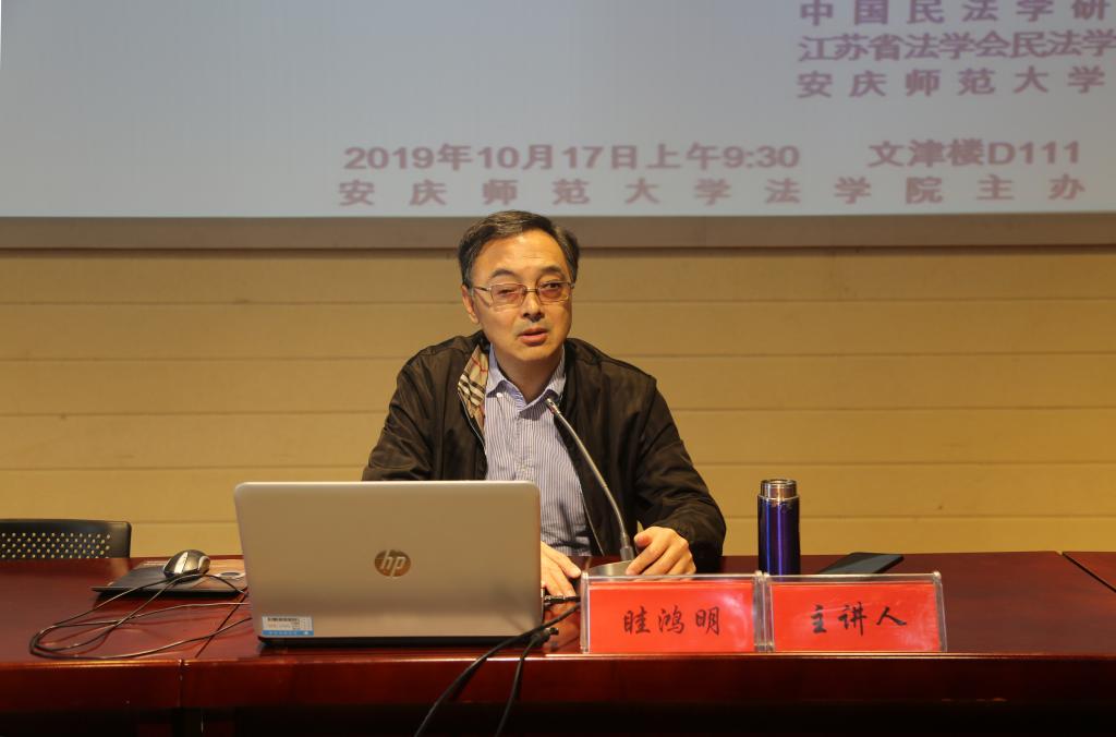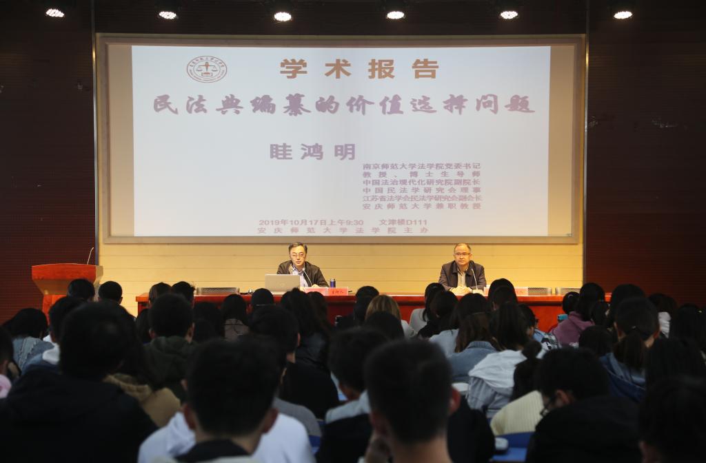 10月17日上午在龙山校区文津楼D111报告厅,南京师范大学法学院党委书记、博士生导师眭鸿明教授来永利官网作“民法典编纂的价值选择问题”学术报告。报告会由法学院院长焦少林教授主持,法学院2019级法律硕士研究生及法学专业2018级、2017级共170余人聆听了报告。