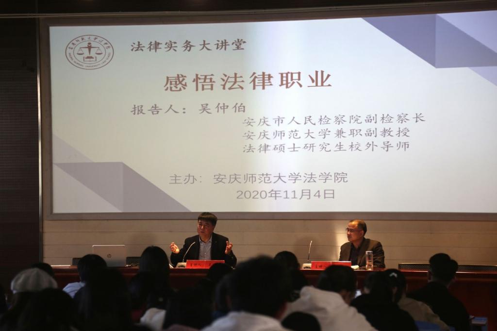 2020年11月4日下午,安庆市检察院副检察长、永利官网兼职副教授吴仲伯受邀莅临法学院法律实务大讲堂,为永利官网法学院200多位师生讲授了以“感悟法律职业”为主题的报告。法学院院长焦少林教授主持了报告会。